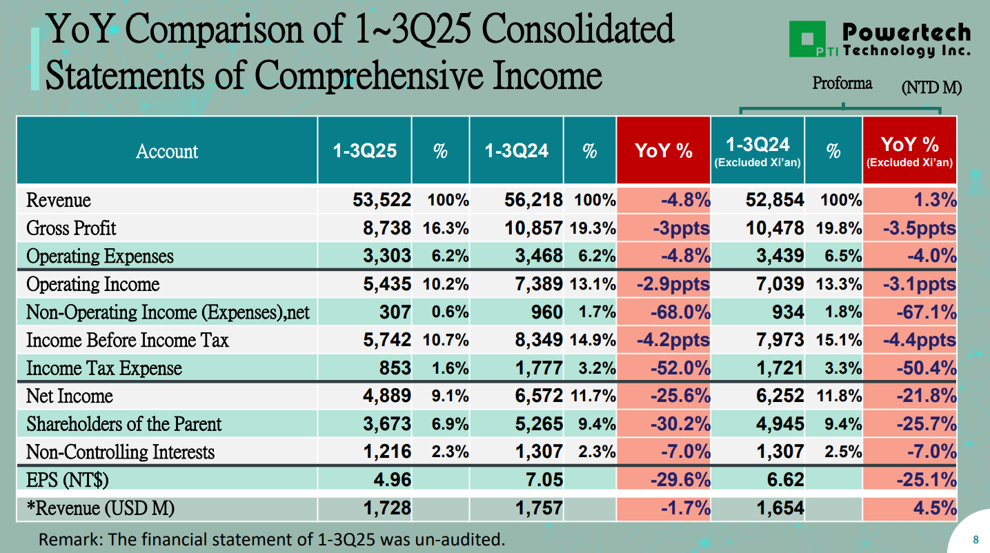 力成第三季營收金額為新台幣 199.68 億元,較第二季增加 10.6%,較2024年同期增加 9.1%,毛利率 16.1%,較第二季增加 0.2 個百分點,較2024年同期減少 5.3 個百分點。稅後純益 15.38 億元,較第二季增加 60.2%,較2024年同期減少 9.5%,EPS為 2.08 元。累計,前三季營收 535.22 億元,較2024年同期減少 4.8%,毛利率 16.3%,較2024年同期減少 3 個百分點,稅後純益 36.73 億元,較2024年同期減少 30.2%,EPS為 4.96 元。