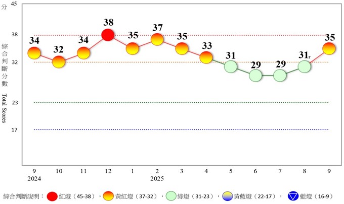 9月景氣燈號綜合判斷分數為35分,較8月增加4分,燈號由穩定的綠燈轉為景氣轉向的黃紅燈。