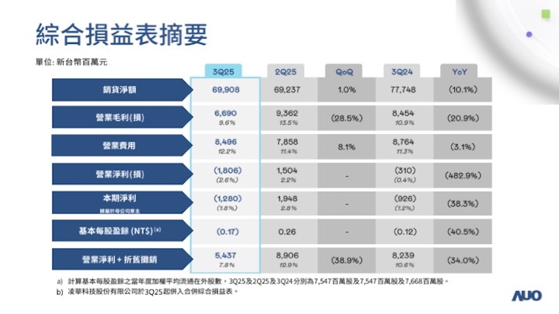 第三季合併營收(台幣,下同)699.1 億元、季增 1%、年減 10.1%,主要受到台幣兌美元平均匯率升值 4.9% 的不利影響。由於台幣升值、面板價格下跌,第三季營業毛利 66.9 億元、季減 28.5%、年減 20.9%,營業毛利率則從上一季 13.5% 降至 9.6%。毛利率從上一季 13.5% 降至 9.6%。第三季歸屬母公司業主淨損 12.8 億元,相較去年同期虧損擴大,每股虧損 0.17 元。然而累計前三季的每股盈餘 0.52 元,相較 2024 年前三季虧損情況則有大幅改善。