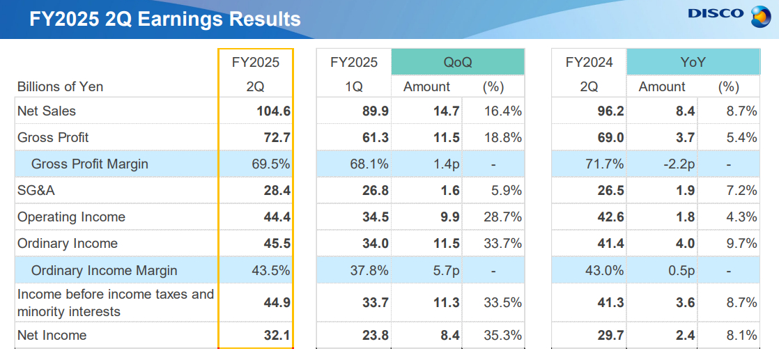 DISCO 29日盤後公布上季(2025年7-9月)財報:因生成式AI相關需求持續強勁,帶動使用於半導體量產的切割機(Dicer)、研磨機(Grinder)等精密加工裝置出貨穩健,合併營收較去年同期成長8.7%至1,046.22億日圓,季別營收創下歷史次高紀錄,合併營益成長4.3%至443.91億日圓,合併純益增加8.1%至321.45億日圓。