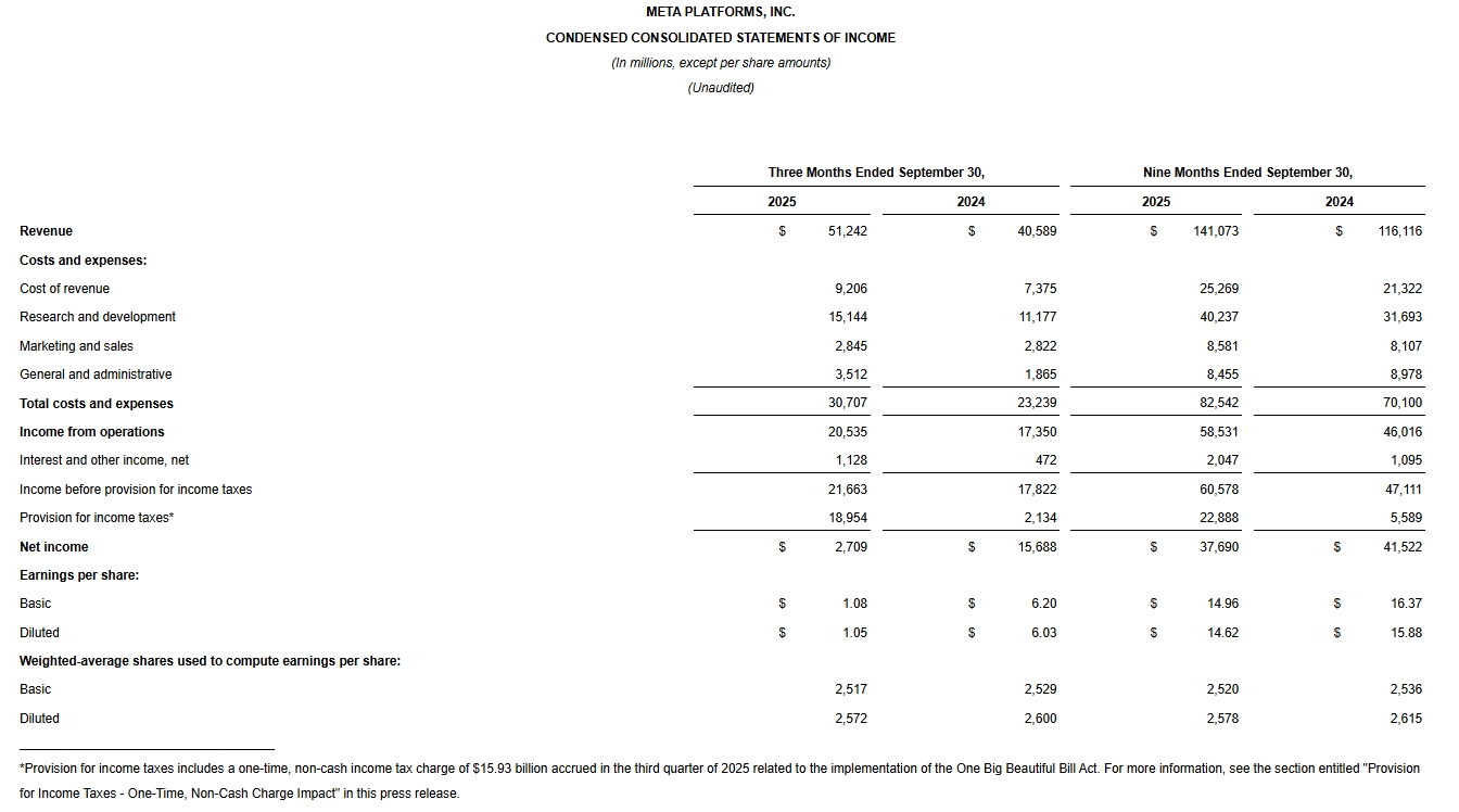 Meta揭露,受川普政府實施的《大而美法案》(One Big Beautiful Bill Act)影響,上季認列一項針對美國聯邦遞延所得稅資產的估值準備,導致159.3億美元的一次性非現金所得稅支出,若不計入該項費用,第三季淨利應為186.4億美元。