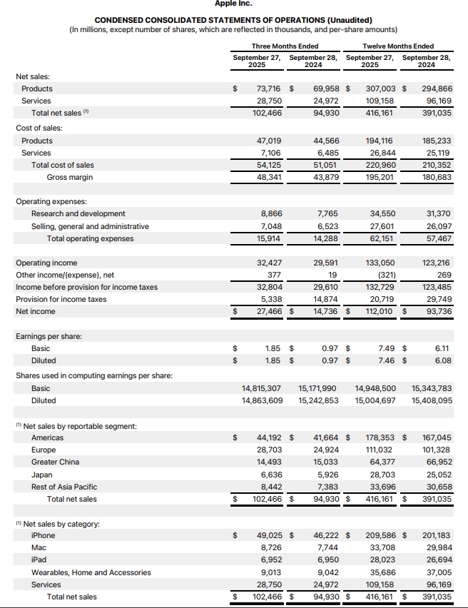 CNBC、華爾街日報等外媒報導,2025會計年度第四季(截至2025年9月27日為止),營收年增8%至1,024.7億美元,優於LSEG統計的分析師預估值1,022.4億美元,每股盈餘為1.85美元,高於分析師預期的1.77美元。當季來自iPhone的銷售額為490.3億美元,略低於市場預估的501.9億美元。