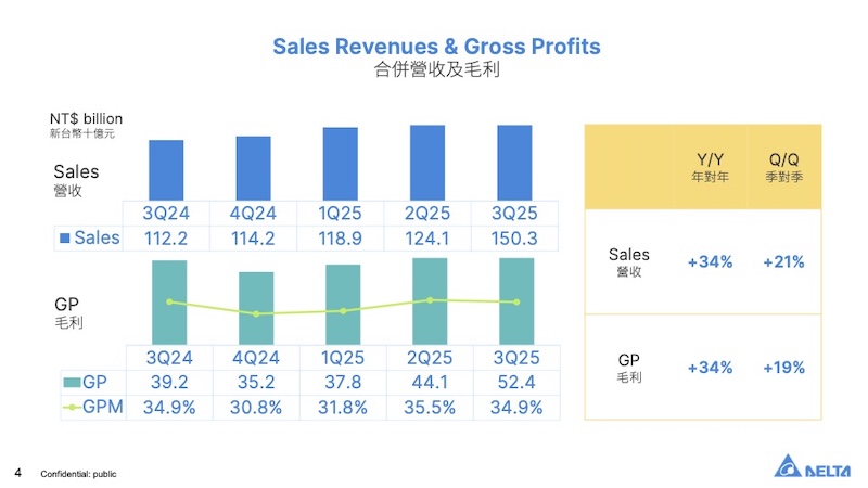 台達第三季合併營收 1,503 億元、季增 21%、年增 34%;毛利 524 億元、季增 19%、年增 34%,毛利率 34.9% 與去年同期相同;營業淨利 248 億元、季增 33%、年增 51%;稅後淨利 186 億元、季增 33%、年增 51%,每股盈餘 7.16 元高於去年同期 4.75 元。