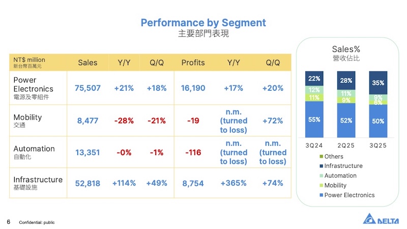 台達電四大部門第三季表現:電源及零組件(Power Electronics)營收 755 億元、年增 21%,獲利 162 億元、年增 17%,基礎設施(Infrastructure)營收 528 億元、年增 114%,獲利逾 87 億元、年增 365%,營收成長來自電源及零組件、基礎設施兩部門的貢獻。交通(Mobility)營收逾 84 億元、年減 28%,自動化(Automation)營收 134 億元與去年同期持平,兩部門皆有小幅虧損。