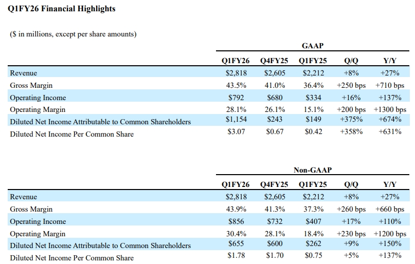根據WD公布的財報資料,2026會計年度第一季(截至2025年10月3日)營收強勁年增27%至28.2億美元,明顯優於華爾街預期的27.3億美元;毛利率從去年同期的37.3%升至43.9%;若排除一次性費用,調整後每股盈餘為1.78美元,同樣高於華爾街預估的1.58美元。