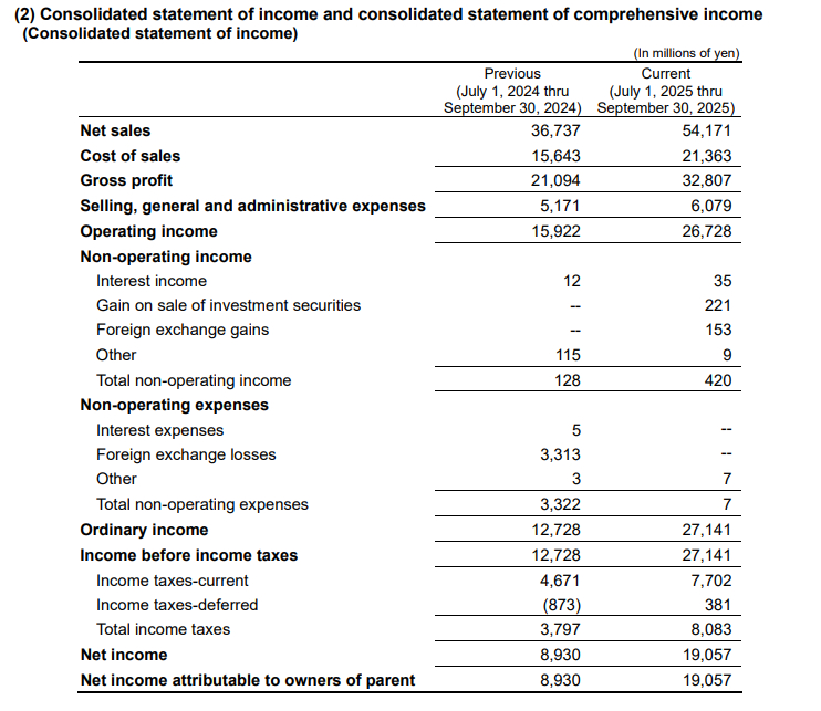Lasertec公布上季(2025年7-9月)財報:因AI伺服器用GPU、HBM需求,推升半導體廠商擴大設備投資,帶動半導體相關設備需求旺,合併營收較去年同期暴增47.5%至541.71億日圓、合併營益暴增67.9%至267.28億日圓、合併純益飆增113.4%至190.57億日圓。