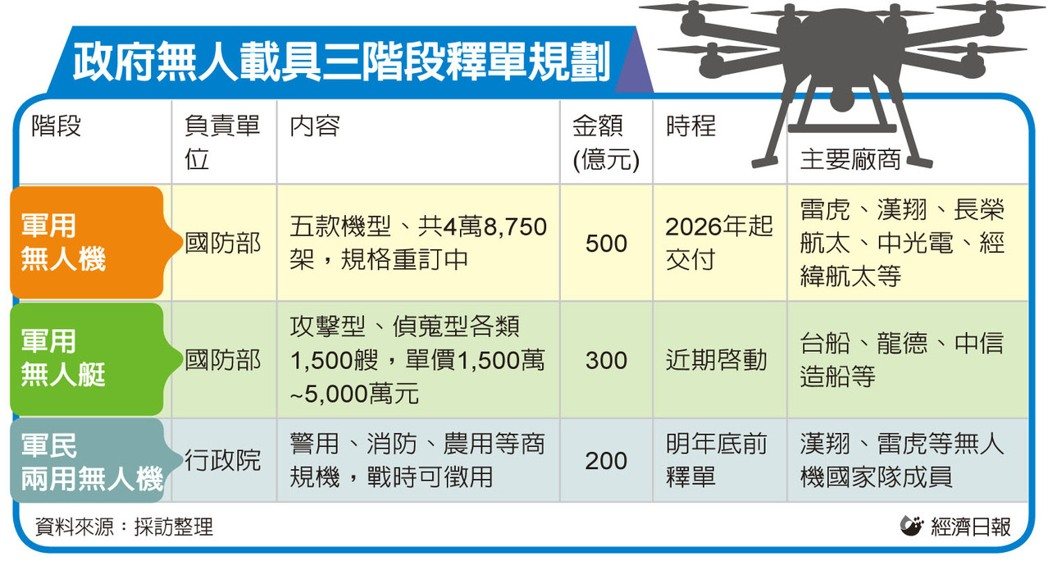 另外,行政院院會稍早通過無人載具產業發展統籌型計畫。上述無人載具計畫概括約200億元,採購公共安全用無人機,涵蓋警用、消防、農用等,屬軍用商規型無人機,一旦戰事發生,可徵收為軍用無人機,此案明年底前陸續釋單。