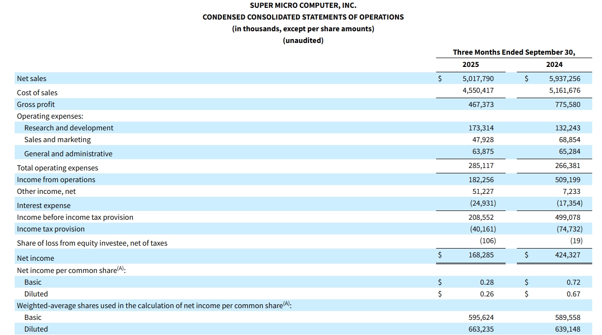 根據美超微4日公布財報,2026會計年度第一季(截至2025年9月30日),營收年減15%至50.2億美元,遜於LSEG統整分析師預估值60億美元;淨利縮減至1.683億美元(即每股盈餘0.26美元),較去年同期的4.243億美元(即每股盈餘0.67美元)腰斬。