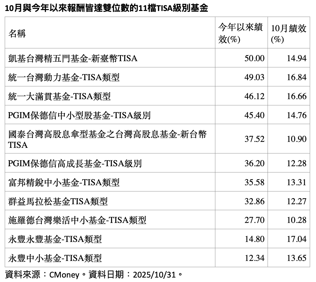 投信積極響應政策推出的 TISA 級別基金,統計目前 21 檔投資國內標的的 TISA 級別基金,今年 10 月單月績效介於 1.7%~17.04%,報酬達雙位數的有 11 檔,而今年以來績效則介於 1.7%~50% 之間,報酬達雙位數的有 13 檔。