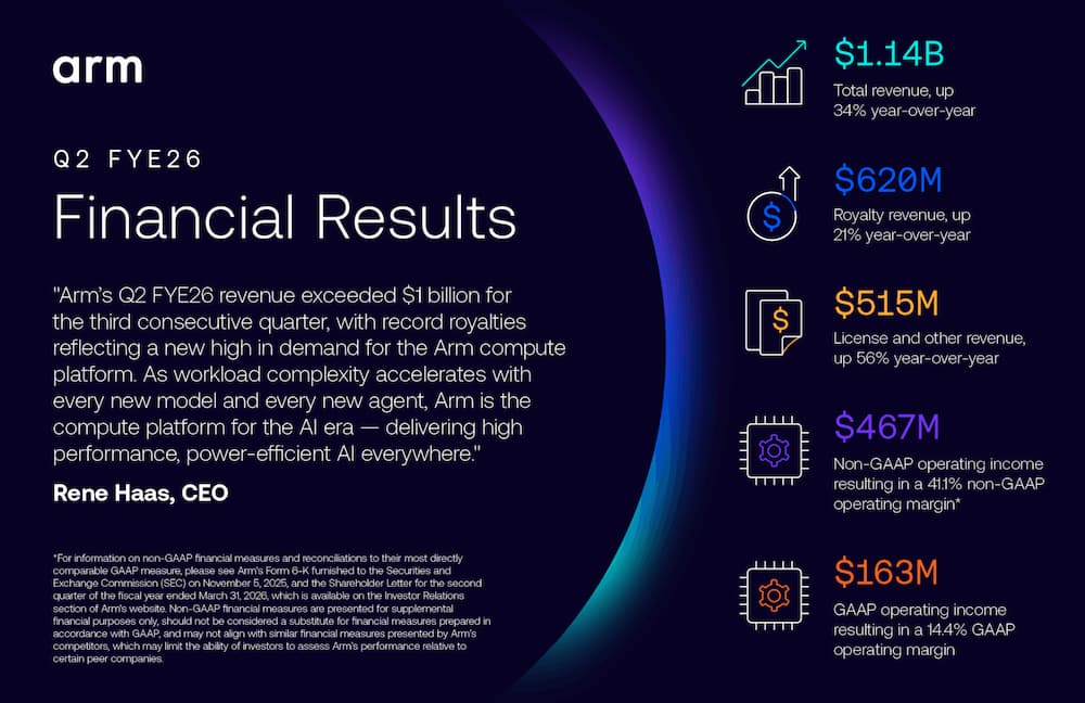 Arm 第二季營收成長 34%,達 11.4 億美元,高於分析師預期的 10.6 億美元;調整後每股盈餘(不含股票報酬等項目)為 0.39 美元,也優於市場預期的 0.33 美元。 Arm 營收來源包括半導體設計的授權費,以及使用其技術生產晶片後所收取的權利金。