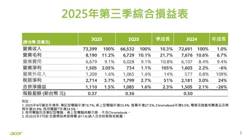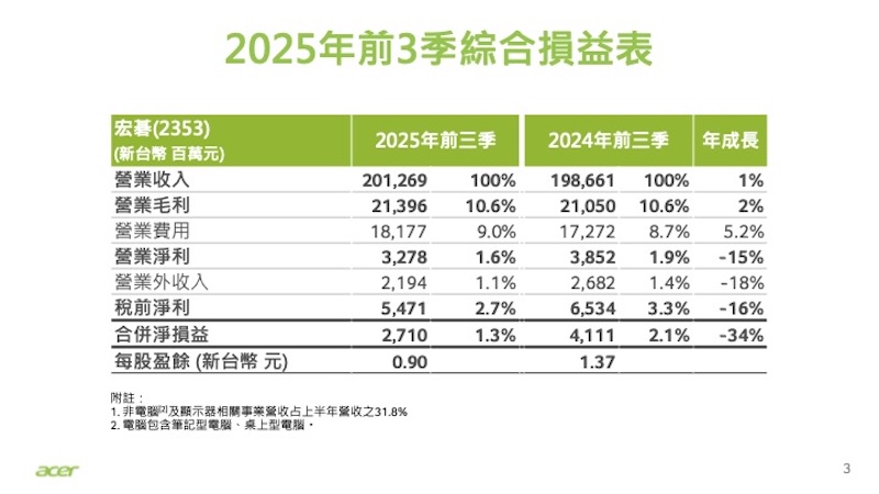 宏碁第三季合併營收(台幣,下同)733.99 億元、季增 10.3%、年對年幾乎持平;毛利 81.9 億元、季增 21.7%、年增 6.7%,毛利率 11.2%;營業淨利 15.05 億元、季增 105.1%、年減 6%,營業淨利率 2.05%;稅後淨利 11.1 億元、季增 2.3%、年減 26%;每股盈餘 0.37 元低於去年同期 0.5 元。