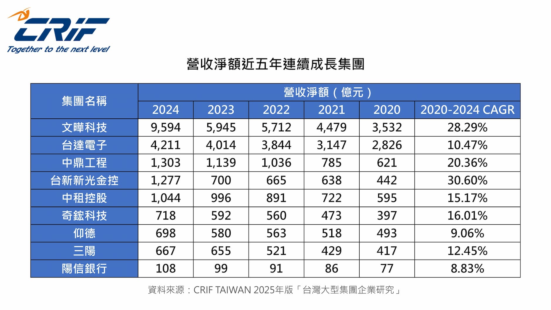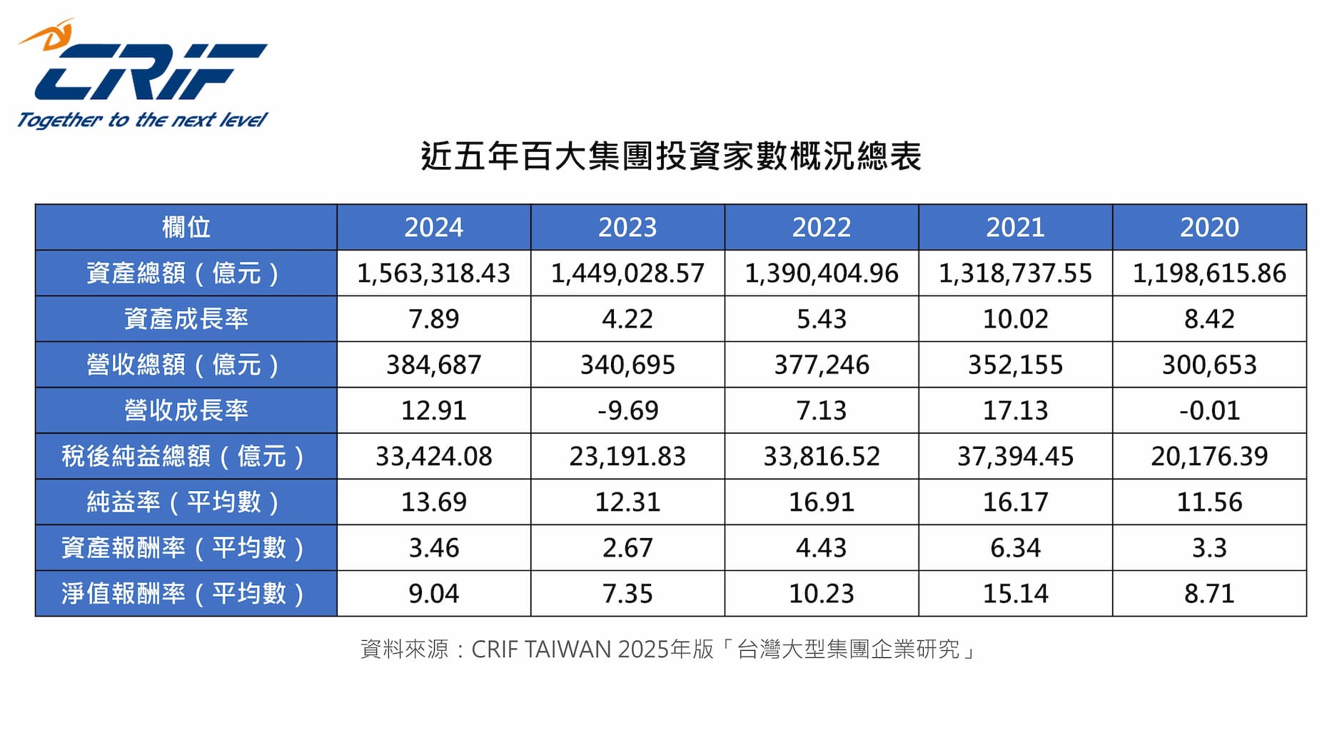 根據 CRIF「2025 年版台灣大型集團企業研究」調查顯示,因美中兩大終端消費市場表現貼近預期,帶領世界經濟走過景氣循環低谷,支撐百大集團成長曲線翻揚,2024 年百大集團資產總額來到 156 兆 3,318 億元、營收總額達 38 兆 4,687 億元雙創歷史新高。