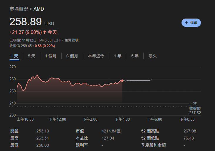 由於執行長蘇姿丰發表了對人工智慧(AI)領域強勁成長的樂觀預期,並駁斥了市場對高額 AI 支出的擔憂,帶動 AMD 的股價強勢上漲了 9%。蘇姿丰強調,投資於 AI 和運算能力是企業加速創新的關鍵,並稱之為「正確的賭注」。