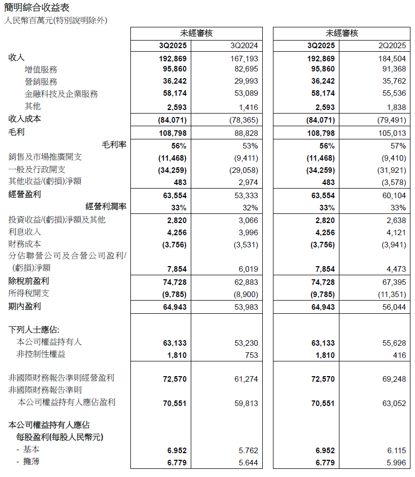 綜合港媒及中媒報導,騰訊公布 2025 年第三季營收 1,928.7 億元(人民幣,下同)、年增 15%,優於市場預估的 1,888 億元;淨利潤 631.3 億元,年增 19%、季增 13%,優於市場預期的 558.8 億元。非國際財務報告準則純利 705.5 億元,年增 18%、季增 12%,勝市場預期。累計今年前三季營收年增 14% 至 5,574 億元;淨利潤 1,665.8 億元、年增 17%;非國際財務報告準則淨利潤 1,949.3 億元、年增 16%。