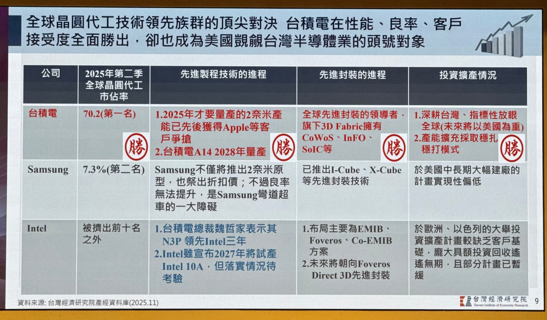 劉佩真指出,川普關稅目前要關注稅率和細則,雖然台積電應能順利過關,但後續對台灣半導體產業的影響巨大,從廠商面來說,投資美國能得到豁免,但投資總額不斷增加,未來先進製程在美生產比重拉高恐成定局,而從產業面說,供應鏈重組將使台灣本土半導體產業遭到弱化。