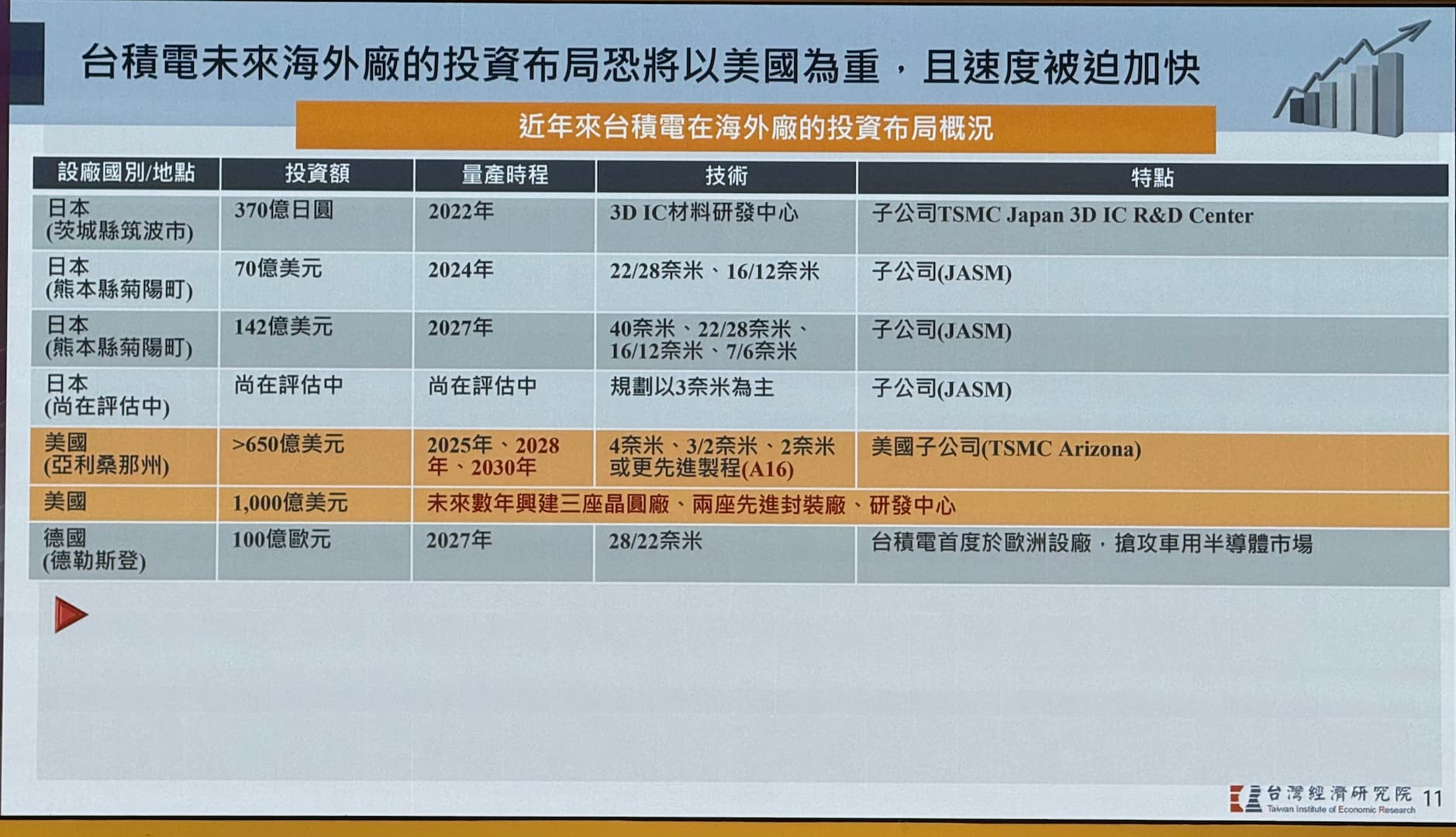 劉佩真認為,美中科技戰牽動台灣半導體供應鏈,特別是 AI 晶片,整體來看,以目前台積電日本、美國、德國設廠布局來看,台積電未來海外廠的投資布局將以美國為重,而且速度被迫加快,其中包含台積電承諾未來幾年將在美國興建三座晶圓廠、兩座先進封裝廠、研發中心。