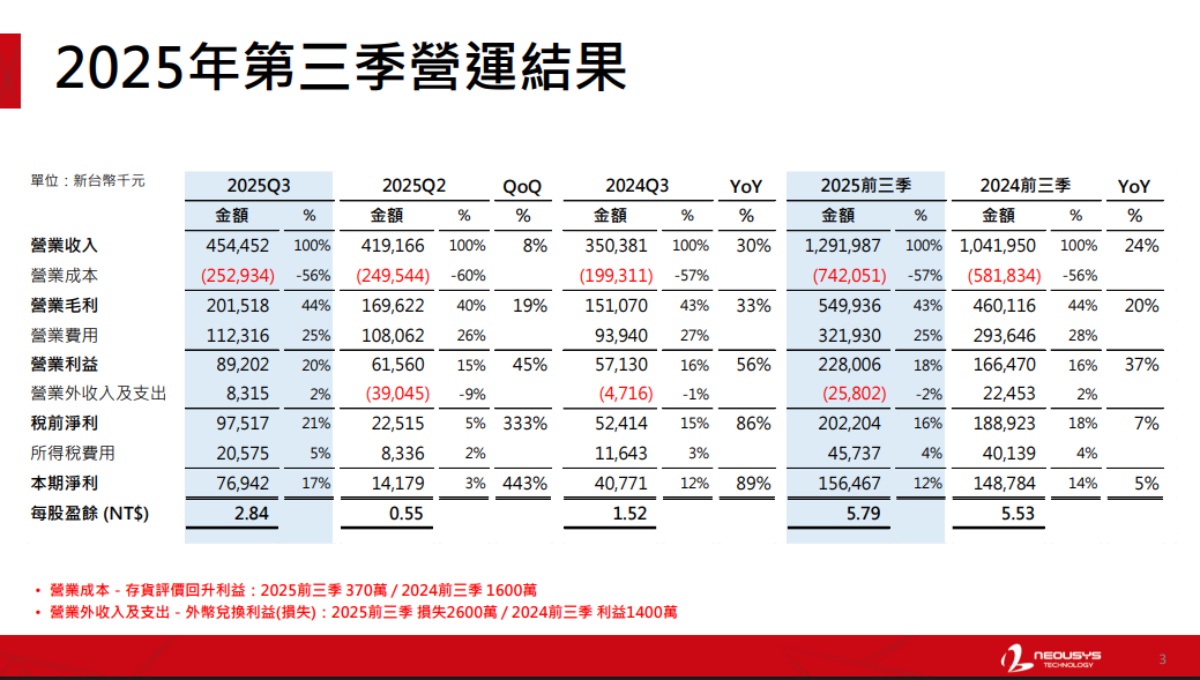 宸曜 2025 年第三季合併營收達 4.54 億元,季增 8%;營業毛利 2.01 億元、毛利率 44%;營業利益 8,920 萬元、季增 45%,稅後淨利 7,694 億元,EPS 2.84元。累計前三季營收 12.919 億元、年增 24%,前三季 EPS 為 5.79 元。公司表示,第三季毛利率的回升主要受惠新台幣走弱與出貨規模增加,使先前提列的存貨評價損失部分回沖。