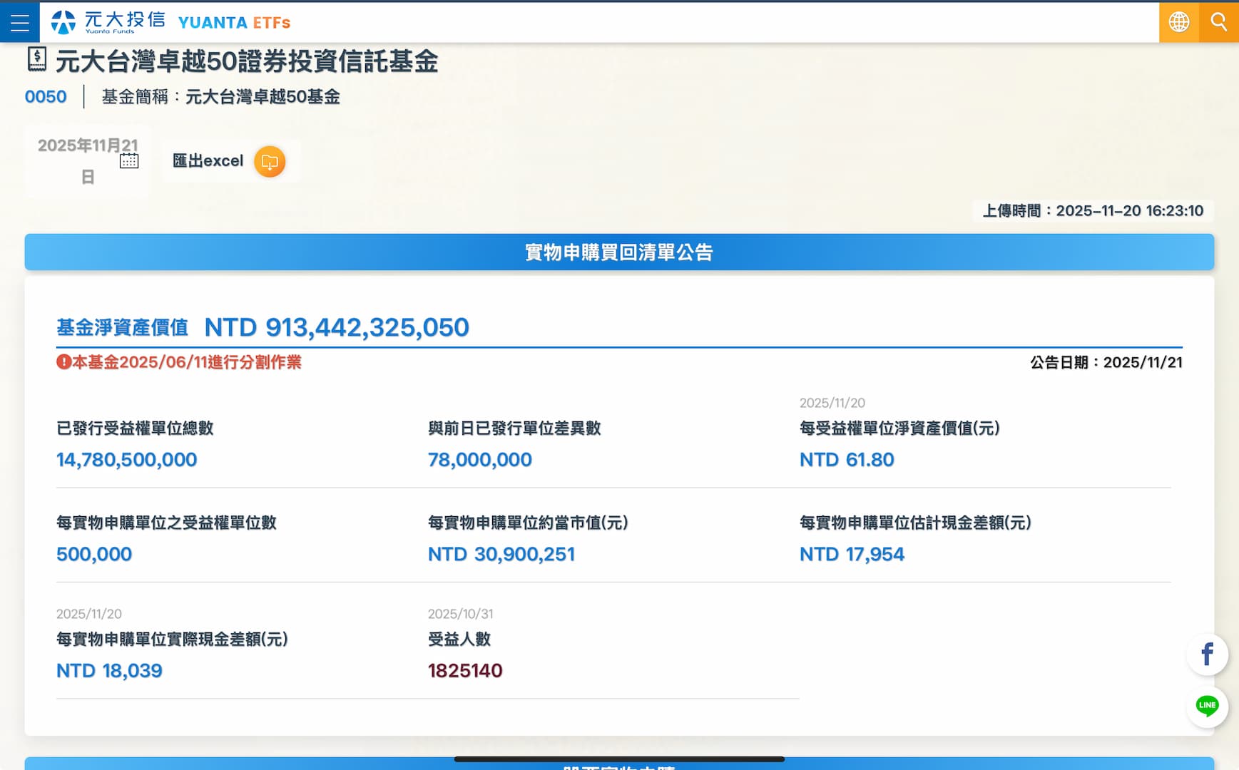 輝達財報亮眼破除 AI 泡沫疑慮,元大台灣 50(0050)規模自 10 月 15 日衝破 8,000 億新高後,受到買氣與台股反彈雙重推升力道影響,最新 11 月 20 日再突破 9,000 億元規模大關,預估最快年底前挑戰成為台股史上首檔兆元級 ETF。