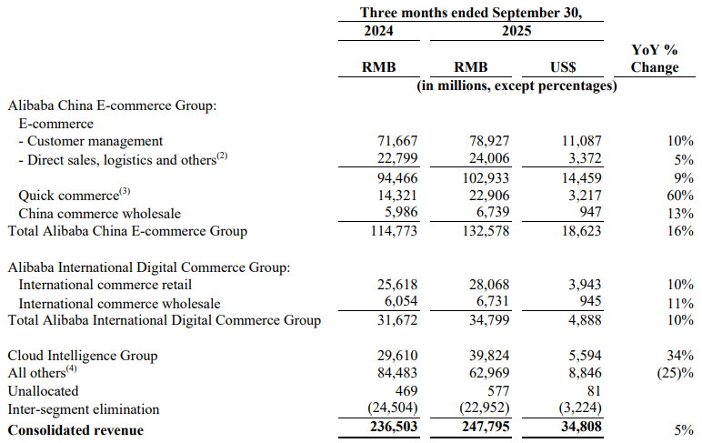 綜合中媒報導,阿里巴巴公布截至 2025 年 9 月底止(2026 財年第二財季)營收 2,478 億元(人民幣,下同)、年增 4.8%,略高於市場預期;調整後淨利潤年減 72% 至 103.5 億元,低於市場預期,盈利能力顯著承壓。
