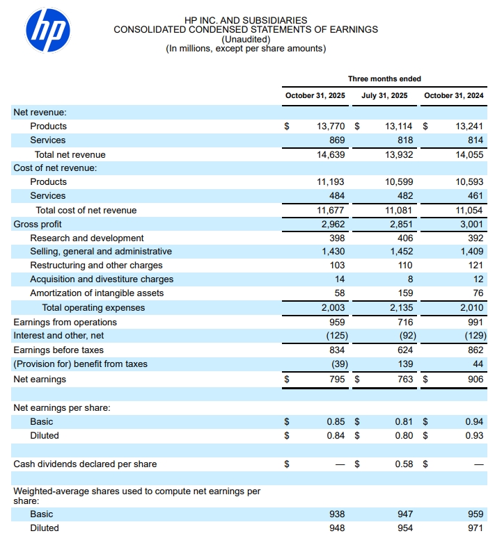惠普於25日美股盤後公布財報,2025會計年度第四季(截至2025年10月31日),營收年增4%至146.4億美元,超越華爾街預測的144.8億美元;淨利7.95億美元,即每股盈餘0.84美元,高於去年同期的7.63億美元,即每股盈餘0.80美元。
