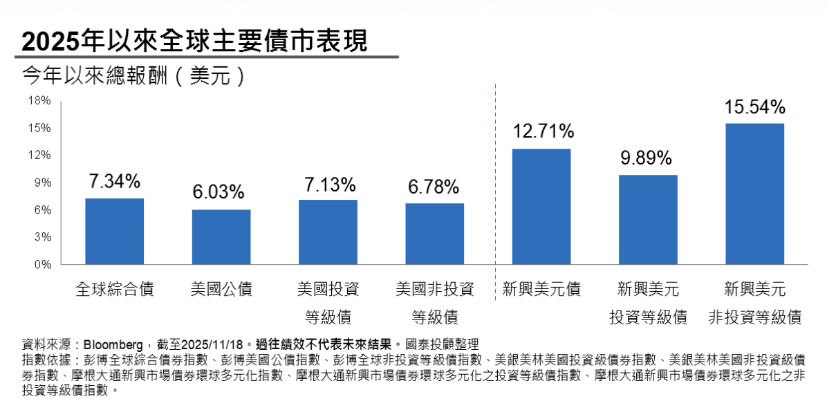 回顧 2025 年全球主要債市表現,新興市場債在全球主要美元計價的固定收益資產中脫穎而出,今年以來新興市場美元債上漲 12.71%,美元非投資等級債更是上漲 15.54%、優於美國非投資等級債上漲 6.78%、美國投資等級債上漲 7.13%、美國公債上漲 6.03%、全球綜合債上漲 7.34%。