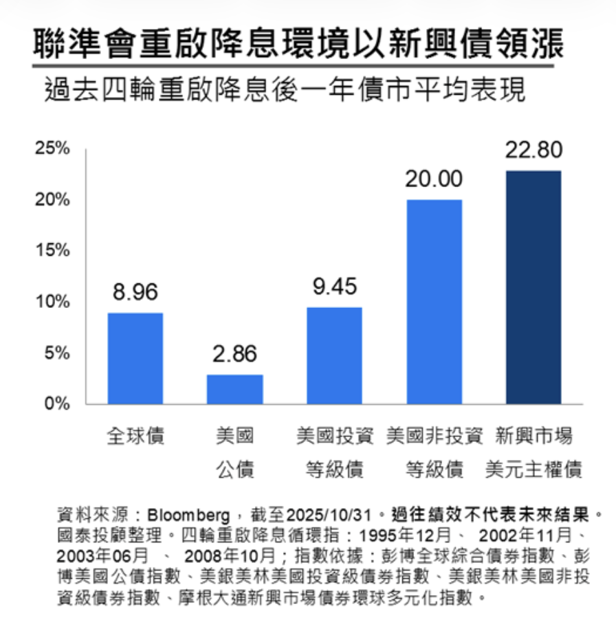 受惠聯準會重啟降息循環,新興市場美元債表現,可望相對領漲其他主要債市,展望 2026 年,國泰投顧認為許多新興市場債國家歷經主權債信評上調、投資人追逐收益,資金正在重返,紛紛對新興市場債資產吸引力推波助瀾,預估新興市場債可望「重裝上陣」,以強勁姿態進入 2026 年。