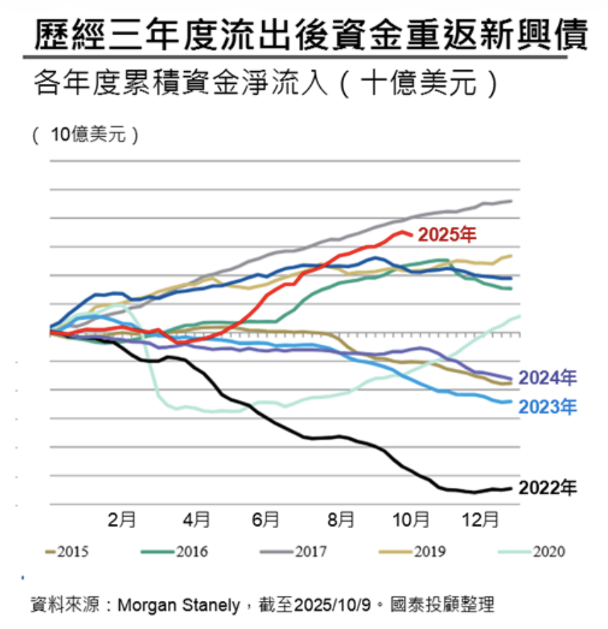 國泰投顧補充,最後資金流加緊腳步重返新興債資產,根據全球 EPFR 資金流向,新興市場債資金流經歷過去三年度資金流出此資產後,終於在 2025 年再度重返,今年以來新興市場債資金淨流入由負翻正。