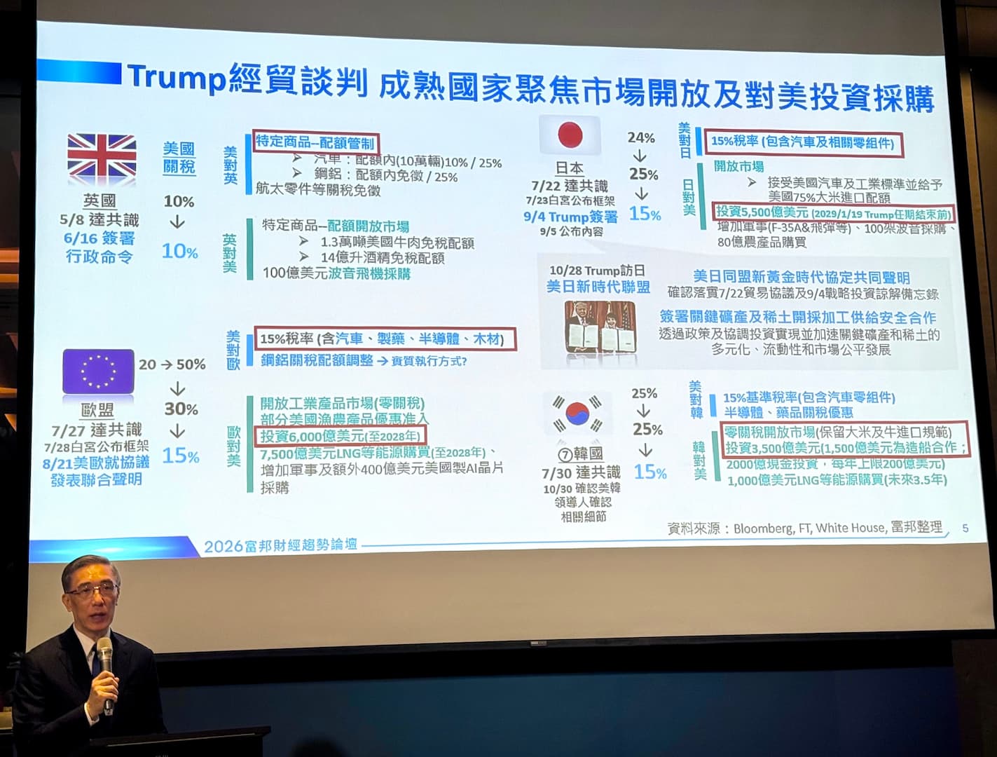 富邦金今日舉辦「2026 富邦財經趨勢論壇」,富邦投顧董事長陳奕光預期,台灣超額儲蓄將突破 5 兆創新高、ETF 新血加入,以及當沖融資更趨熱絡,台股電子、金融、傳產原物料皆有表現空間,預期指數將以「微笑曲線」走向 32,000 點,年中逢低佈局,樂觀情境有機會挑戰 34,000 點。