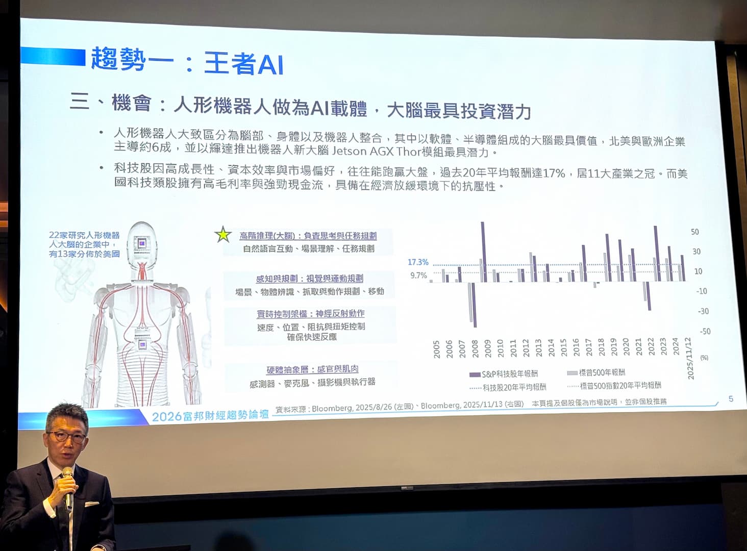 陳奕光認為,2026 年台股將走出對等關稅及台幣大幅升值陰霾,預估 2026 年台股獲利年增 20%,從次產業角度分析,電子股主要受 AI 伺服器及 Edge AI 需求帶動,預估獲利成長 22%;金融股受惠股匯債市回溫,預估獲利成長 7%;傳產原物料因受惠政策,預估獲利成長 20%。