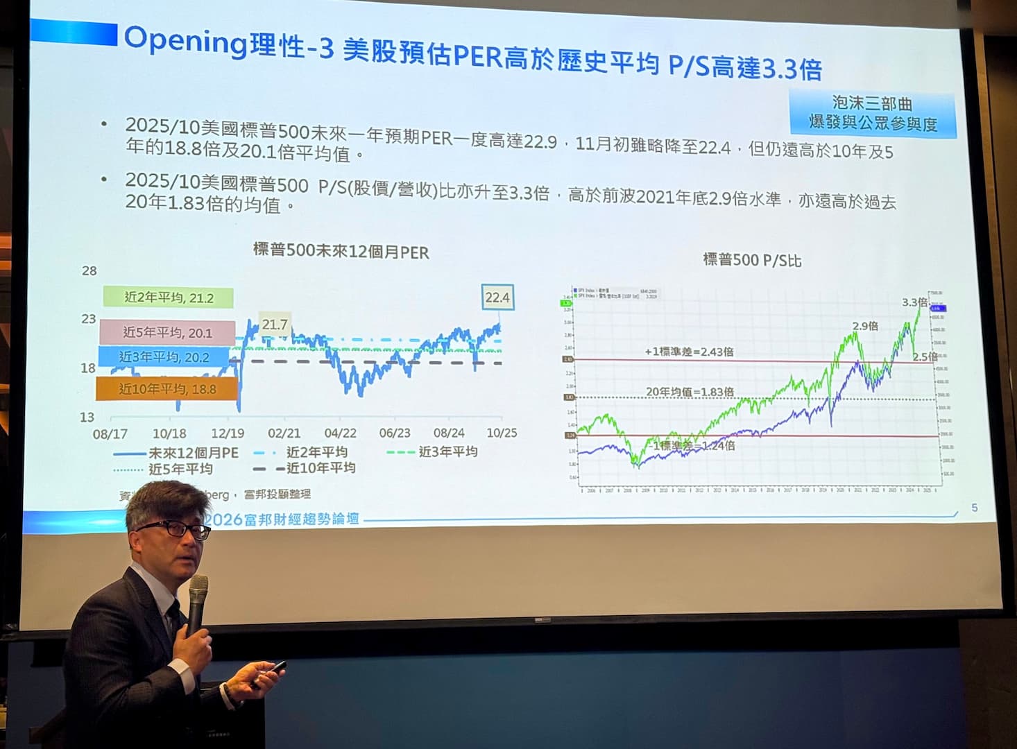 陳奕光提出「金馬選股術」,建議可瞄準政府國防、高速傳輸及高頻寬記憶體、OpenAI 雲端建置供應鏈、機器人與自駕車、原物料、半導體族群、電力能源,以及 ETF 等族群布局,但股市體重機也進入歷史警戒,美股巴菲特指數逾 240%,趨近 2021 年因擴大 QE 所創下的 248% 歷史新高。