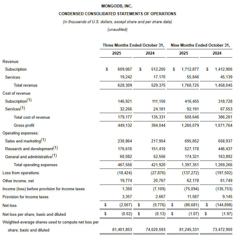 CNBC、Investing.com等外媒報導,MongoDB於12月1日美股盤後公布,2026會計年度第三季(截至10月31日為止),營收年增19%至6.28億美元,大幅優於LSEG統計的分析師預估值5.92億美元,經調製每股盈餘1.32美元,也超過華爾街預期的0.80美元。