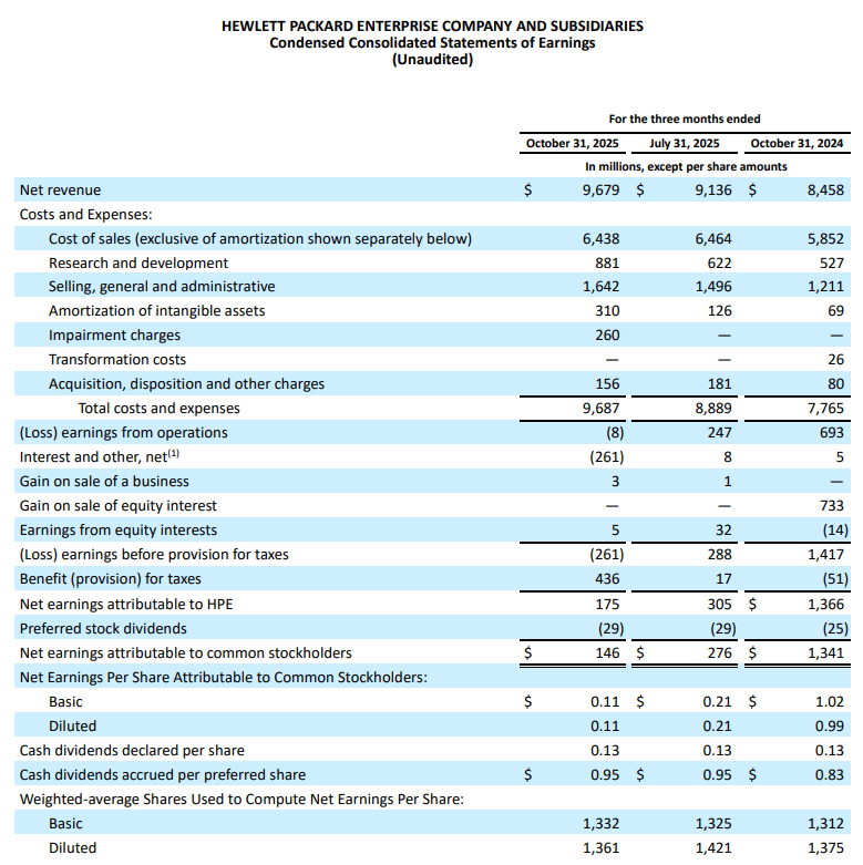 慧與財報顯示,2025會計年度第四季(截至2025年10月31日),營收年增14%至96.8億美元,遜於FactSet調查所預期的99億美元;淨利1.75億美元,即每股盈餘0.11美元,遠低於去年同期13.7億美元、即每股盈餘0.99美元。