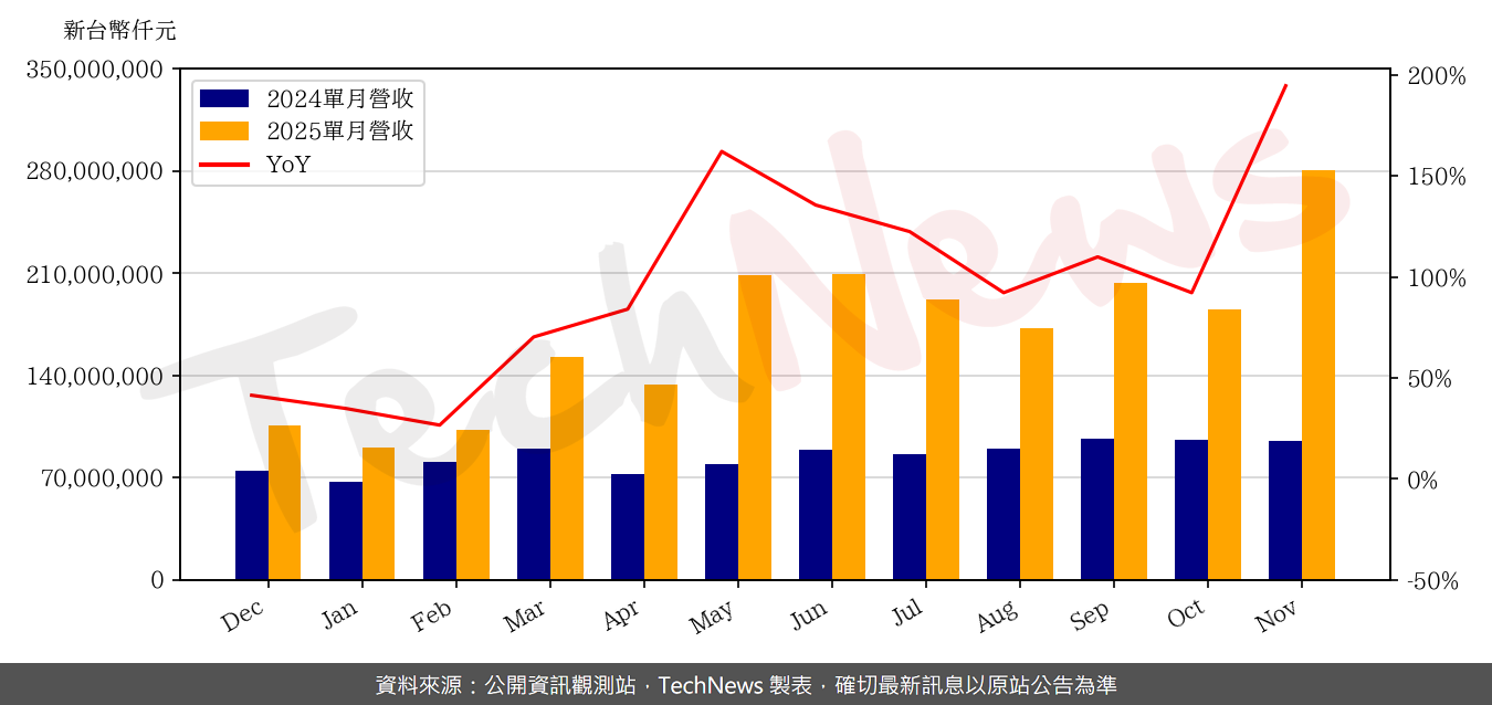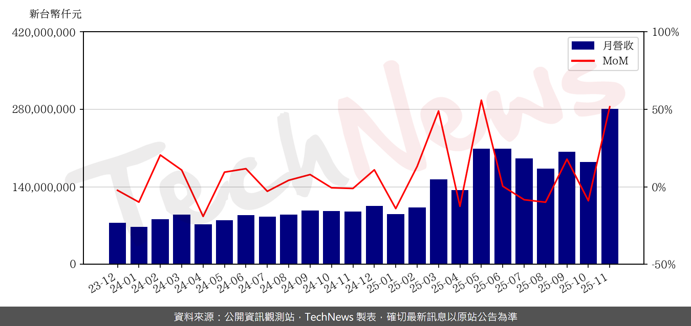 緯創表示,11 月營收動能主要來自 AI 伺服器出貨衝高,原本公司預期 AI 伺服器出貨高峰將落在 11、12 月,如今確認 11 月就是這一波的出貨高峰,推升單月營收表現亮眼,而 12 月受季節性因素影響,筆電出貨將有微幅月減。