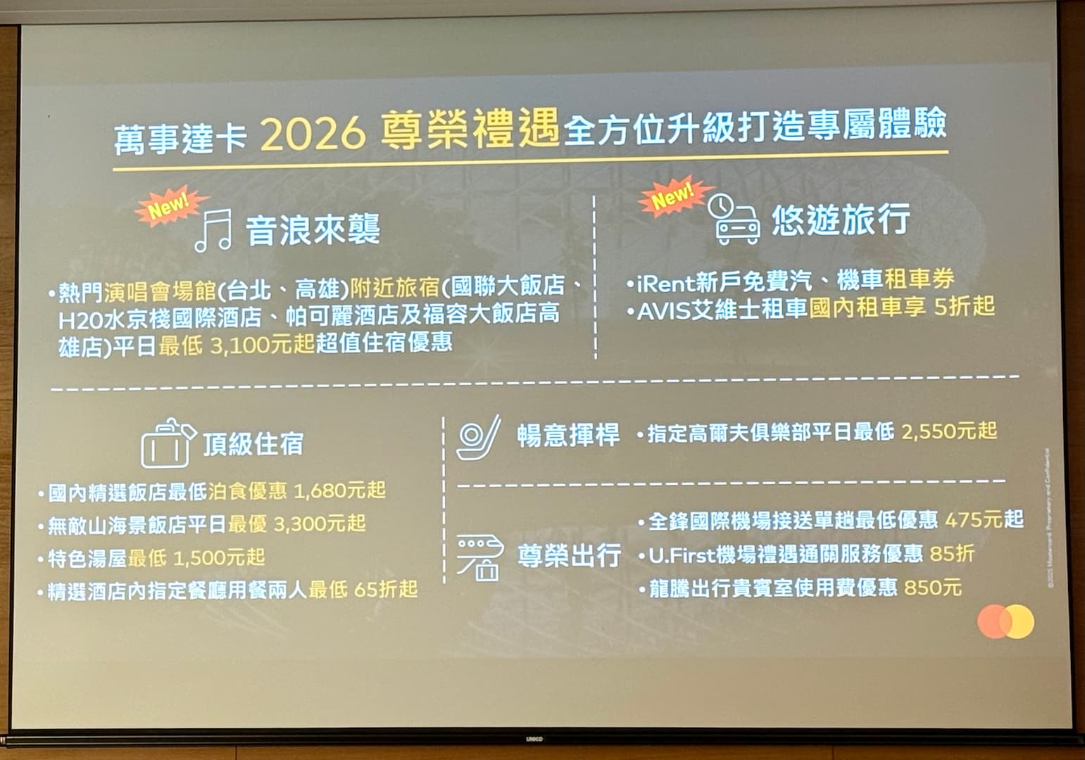 萬事達卡宣布全新升級 2026 尊榮禮遇,首次精心打造演唱會周邊星級旅宿優惠,更擴展全年度精選優惠,為持卡人提供機場與出行接送、日韓行李專人配送服務、共享租車、頂級旅宿、美食饗宴等全方位專屬禮遇。