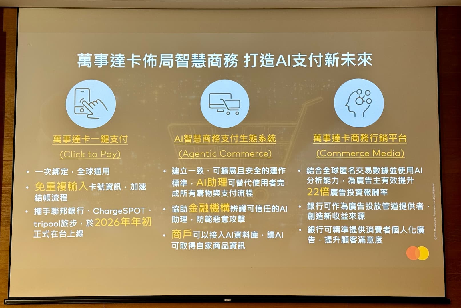 萬事達卡今日宣布明年初將在台灣推出 AI 一鍵支付(Click to Pay),持卡人只要首次使用在萬事達卡一鍵支付網頁建立帳號、綁定卡片,日後就能在全球任何支援一鍵支付的網站購物,並公布 2026 尊榮禮遇全方位升級,首次推出演唱會周邊精選住宿禮遇。