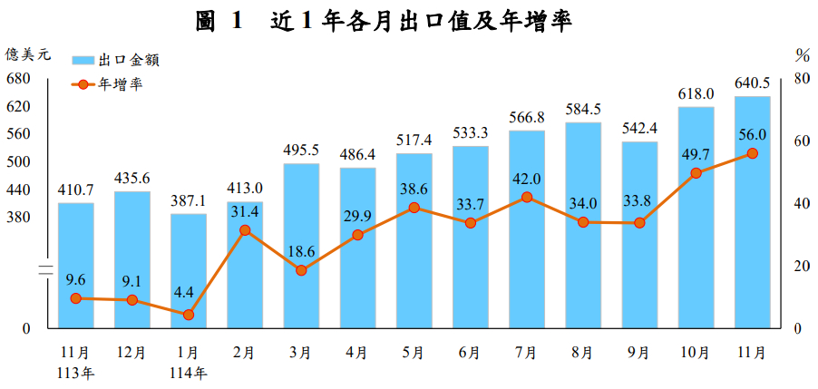 受惠於人工智慧(AI)、高效能運算等新興科技應用商機熱絡,持續推升出貨動能,財政部 9 日公布 11 月海關進出口貿易統計,11 月出口 640.5 億美元,進口 479.7 億美元,雙創歷年單月新高。