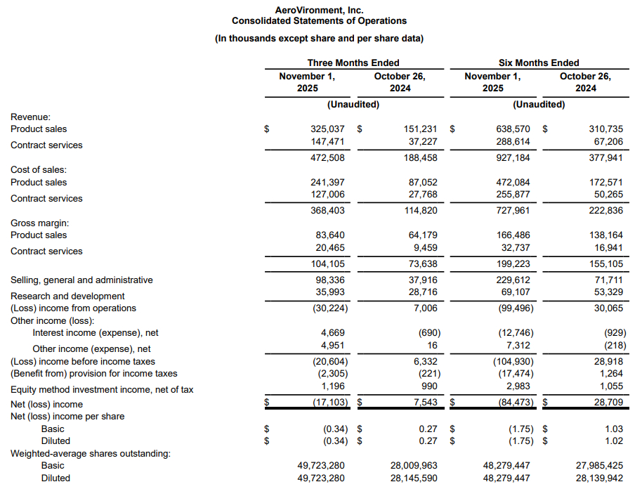 巴隆周刊等外媒報導,AeroVironment於9日美股盤後公布,2026會計年度第二季(截至2025年11月1日為止),營收年增151%至4.725億美元(包含收購BlueHalo的營收),優於華爾街預期,每股盈餘44美分,遜於市場預期的78美分,主要受收購相關費用影響。
