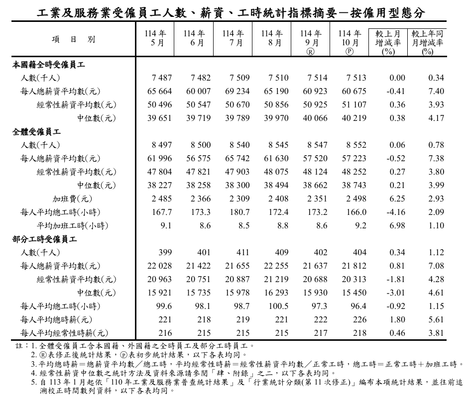 主計總處統計,10月工業及服務業受僱員工平均經常性薪資為新台幣4萬8,252元,年增3.80%,創近26年單月最高紀錄。
