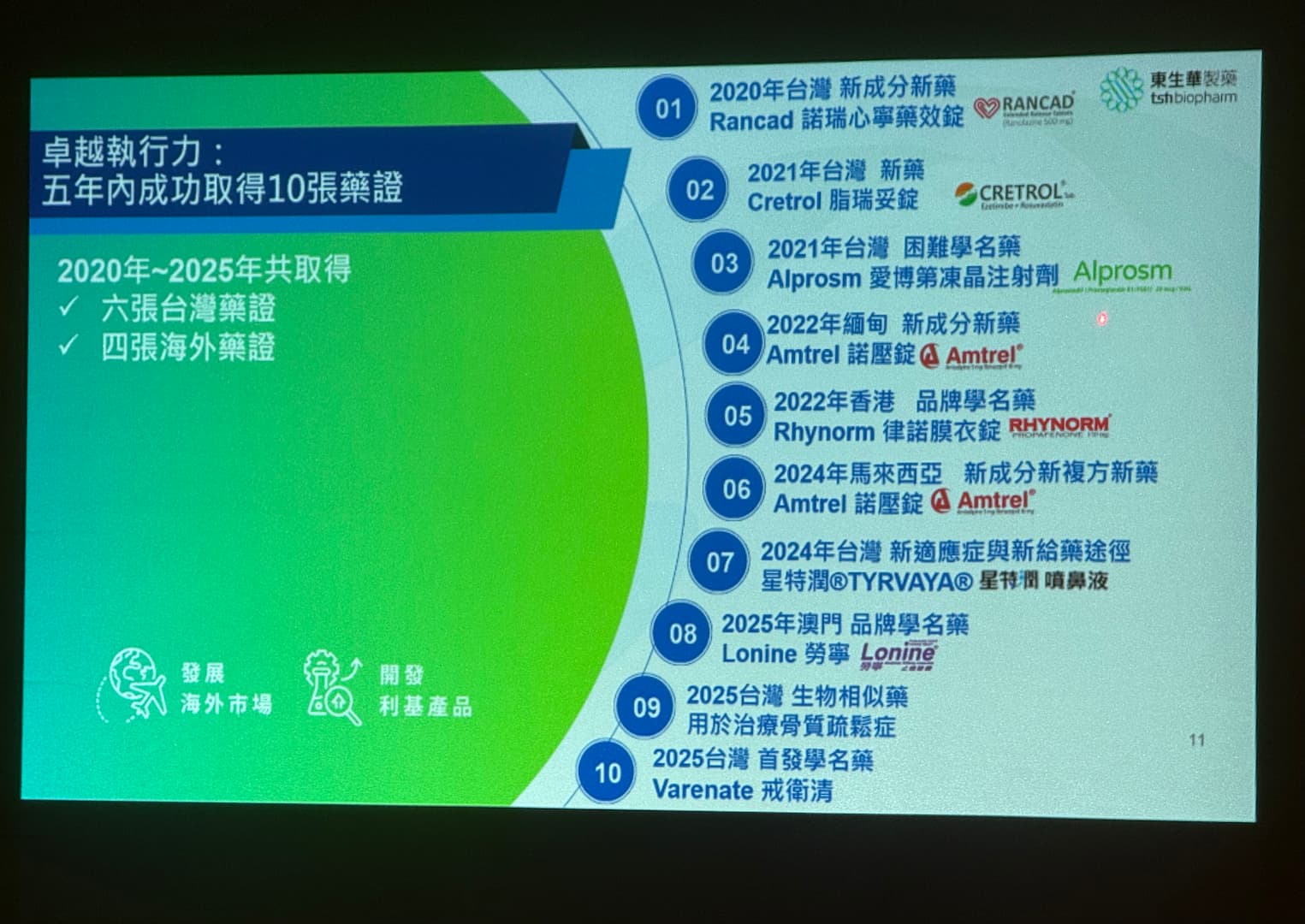 楊思源指出,東生華原訂五年內取得十張藥證的策略目標已成功達標,包括六張台灣藥證與四張海外藥證,其中 2025 年成果豐碩,包括在台灣取得戒菸錠劑首發學名藥 Varenate(戒衛清)藥證,而海外布局更橫跨高血脂、心律不整及止痛領域,展現精準的選題與跨國取證能力。