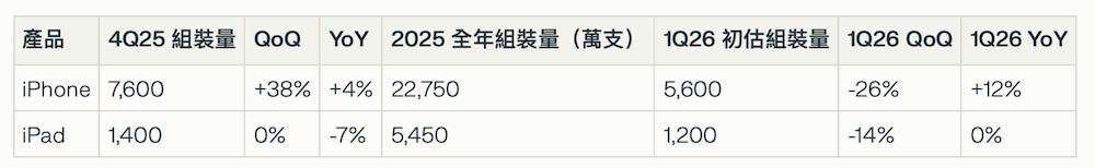 至於 2026 年第一季,iPad 組裝量預估約 1,200 萬支,季減 14%、年持平,整體表現仍符合季節性走勢。大摩認為,整體來看,iPhone 將是 2026 年初蘋果硬體動能的主要支撐來源。