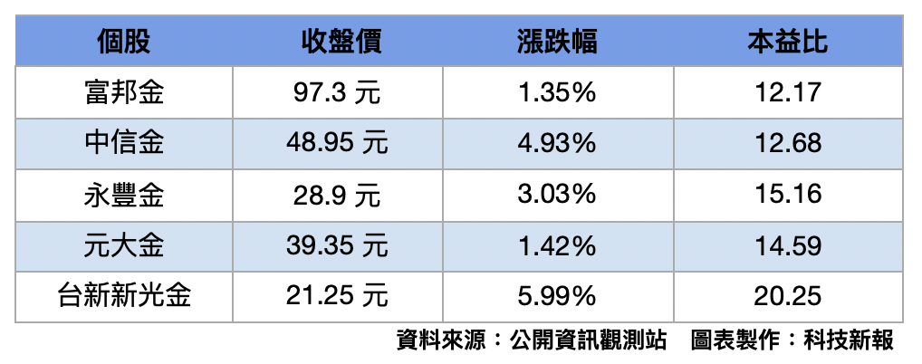 台股類股表現,以金融股狂飆最為搶眼,金融保險類股指數盤中漲幅一度超過 2%,資金明顯回流至高殖利率與防禦型題材,台新新光金、中信金、元大金、永豐金及富邦金均改寫股價新高,凱基金、國泰金、玉山金、第一金同步轉強。