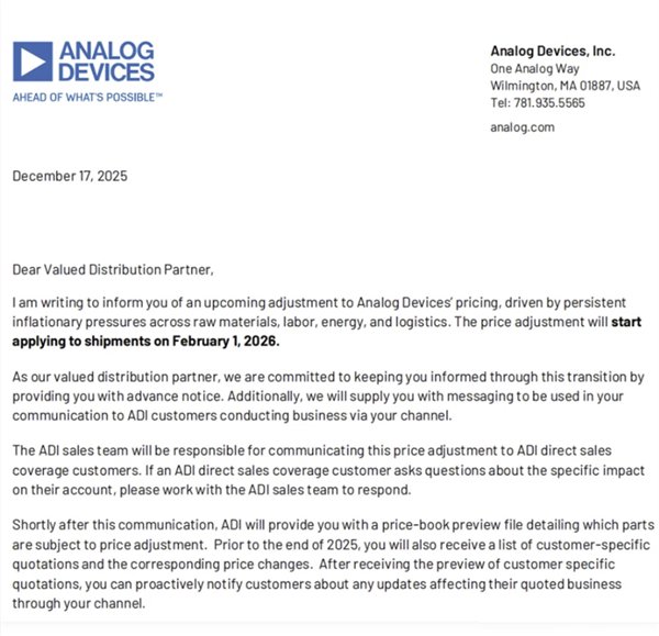 根據網上流傳, ADI 於日前發出的官方信函指出,本次價格調整將自 2026 年 2 月 1 日起正式適用於所有出貨產品。值得注意的是,此次漲價方案並非單一漲幅,而是針對不同客戶層級及產品料號採取差異化策略。市場消息指出,整體平均漲幅預計約為 15%,且新的價格將一併適用於所有尚未出貨(Unshipped)的訂單。