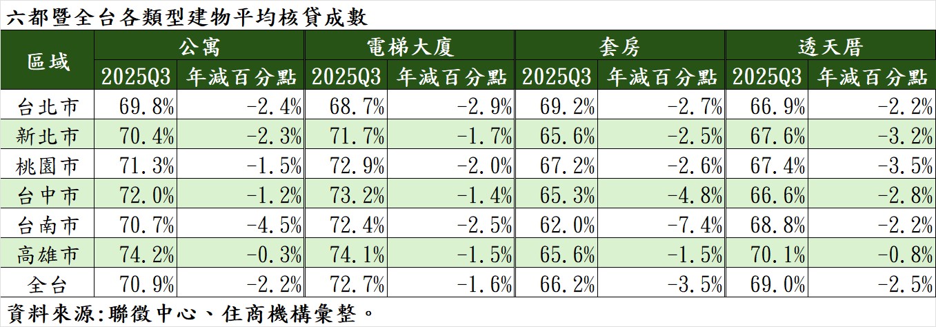 根據數據,全台六都第三季各類型建屋平均核貸成數與去年同期相比,皆有不同程度下滑,其中套房、透天厝平均貸款成數皆不滿七成,分別為 66.2%、69%,為各類建物中最低,分別年減 3.5、2.5 個百分點,下滑數值也是最高。