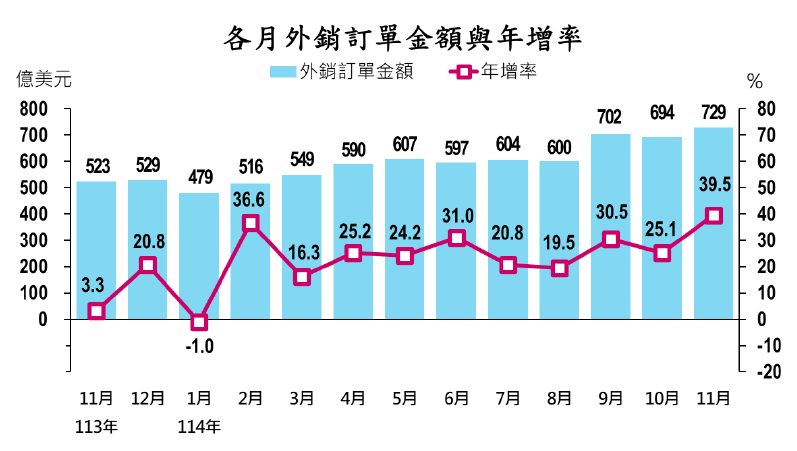 11 月外銷訂單 729.2 億美元年增近四成,寫單月新高