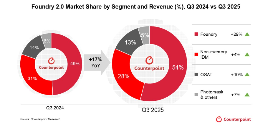 報告還指出,傳統僅涵蓋晶圓製造的 「Foundry 1.0」 定義已無法完整反映當前產業結構。「Foundry 2.0」 的範疇進一步納入純晶圓代工廠、非記憶體 IDM、封測(OSAT) 業者以及光罩供應商。Counterpoint Research 研究副總裁 Neil Shah 表示,企業正從單一製造環節,轉型為技術整合平台。這樣的轉變有助於強化垂直整合、加快創新速度,並在 AI 時代實現更深層的系統級價值創造。