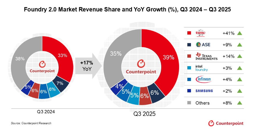 根據市場研究及調查機構 Counterpoint 的最新研究報告顯示,全球半導體 「Foundry 2.0」 市場於 2025 年第三季營收達 848 億美元,較 2024年同期相比成長 17%,主要受惠於 AI 帶動先進製程與先進封裝需求,其中台積電與中國晶圓代工廠表現突出。受惠於 3 奈米放量 及 4/5 奈米製程滿載,台積電營收年增 41%,市佔持續擴大。