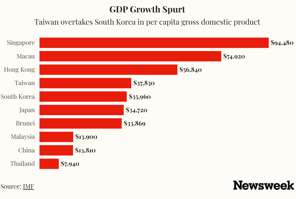 美國《新聞週刊》報導,國際貨幣基金(IMF)數據,由於國際市場對先進半導體的強勁需求,台灣今年人均國內生產毛額(GDP)超越經濟強國韓國,也領先日本。