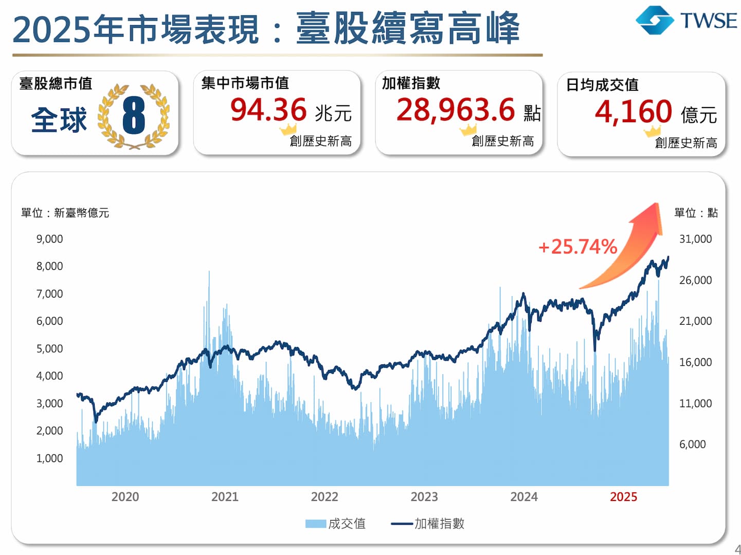 林修銘指出,台股 2025 年價量齊揚、屢創新高,加權股價指數收在 28,963.6 點,上市公司總市值突破 94 兆元,推升台股規模躍升全球第 8 大,成交動能與籌資表現亦同步刷新歷史紀錄,而在今年加權股價指數更一舉突破 3 萬點,總市值挑戰100 兆元,創全球排名第 7 大的佳績。