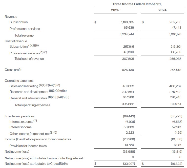 CrowdStrike財報顯示,2026會計年度第三季(截至2025年10月31日止),營收年增22%至12.3億美元,優於市場預期的12.1億美元;調整後每股盈餘0.96美元,也高於市場預期的0.94美元,反映營運動能穩健。