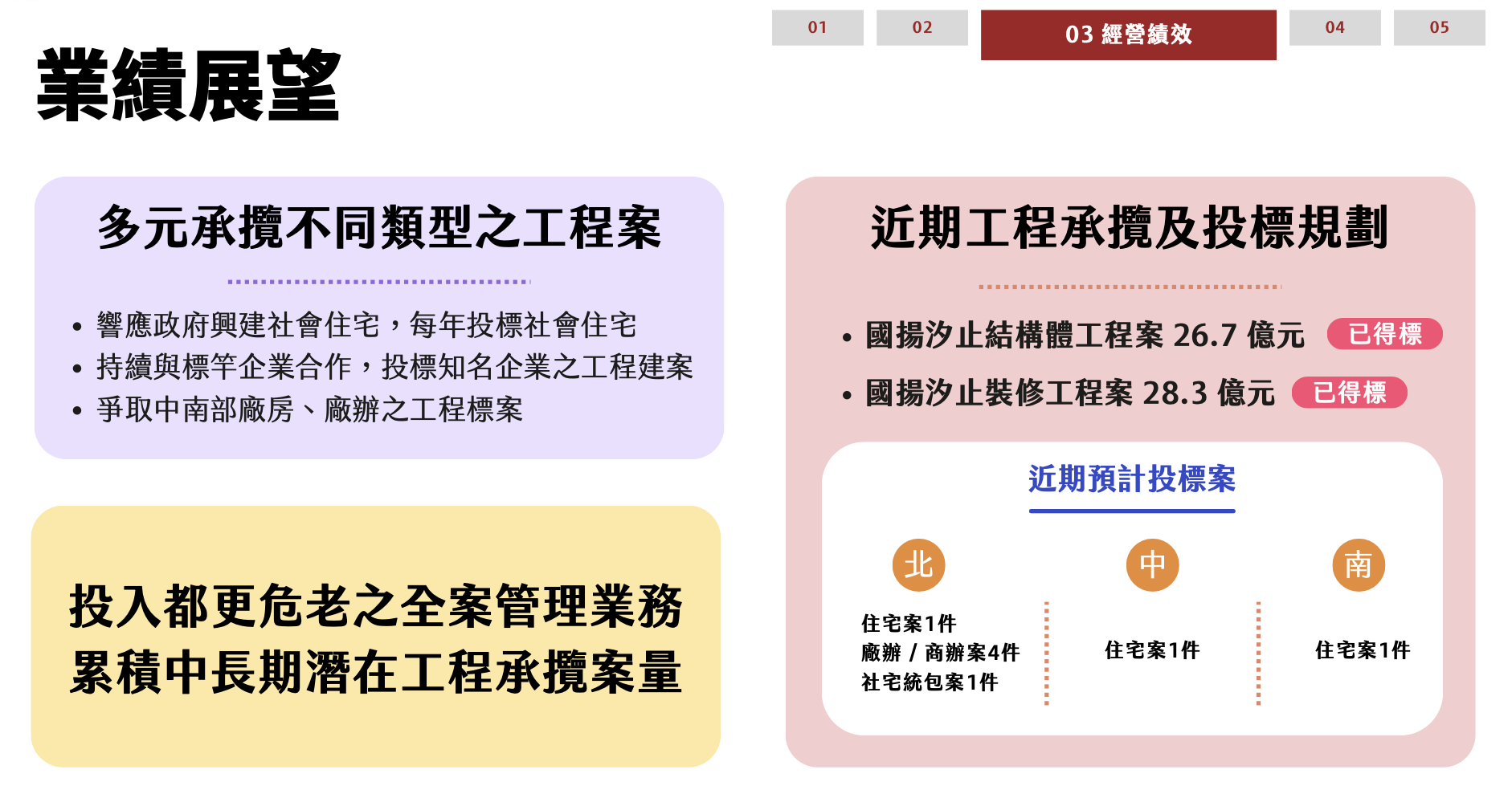 林世貞分享,受惠政府推動社宅政策,內政部規劃 2025 年至 2032 年直接興建 25 萬戶社宅,久舜提前卡位國家住都中心標案,截至 2025 年底已取得 3 項社宅統包工程,承攬金額合計 49.34 億元,並在社宅統包領域具有競爭優勢。